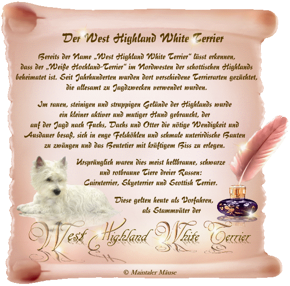 galten weiße oder hell gefärbte Welpen als minderwertig, man traute ihnen keine guten Arbeits- und Jagdeigenschaften zu und hielt sie für krankheitsanfälliger, und so wurden sie oft gleich nach der Geburt getötet. Wie es dennoch dazu kam, dass im Laufe der Zeit hellsandfarbene und weiße Terrier gezüchtet wurden, aus denen dann schließlich der "Weiße Hochland-Terrier" entstand, belegt folgende Geschichte: Colonel Edward Malcolm, Laird of Poltalloch, besaß eine Zucht cairnartiger Terrier, unter anderem einen roten Lieblingsterrier. Bei der Jagd nun verwechselte er den Rüden mit einem Fuchs und erschoss ihn irrtümlich. Tief betrübt beschloss der Colonel, zukünftig nur noch weiße Terrier zu züchten, und so entstand eine eigene Linie, die sog. Poltalloch-Terrier, Vorgänger der heutigen West Highland White Terrier. Bald wurde der Nachweis erbracht, dass die "neuen" weißen Terrier ebenso gut zur Jagd geeignet waren und ansonsten die bekannten guten Terrier-Eigenschaften besaßen, so dass es um die Jahrhundertwende zur Gründung eigener Rassezuchtvereine kam, in deren Folge 1906 der "West Highland White Terrier Club of England" entstand. Nach Anerkennung als eine eigenständige Rasse durch den "American Kennel Club" 1907 und Eintrag ins Terrier-Zuchtbuch in Deutschland 1910 gewann der West Highland White Terrier immer mehr an Popularität, bis in den letzten Jahrzehnten aus dem ursprünglichen Jagdhund ein sehr beliebter Begleit- und Familienhund, ja ein regelrechter Modehund geworden war. |
