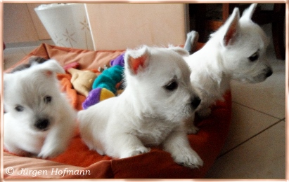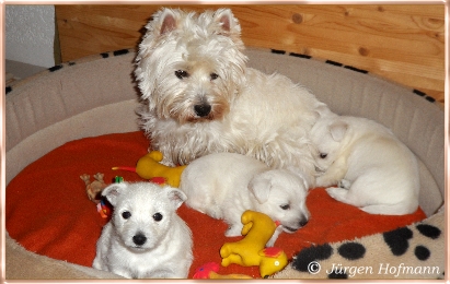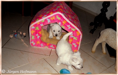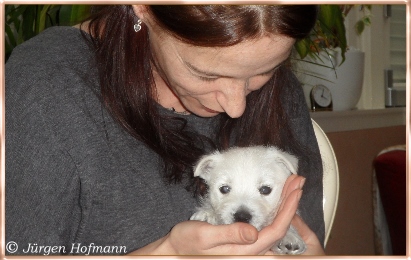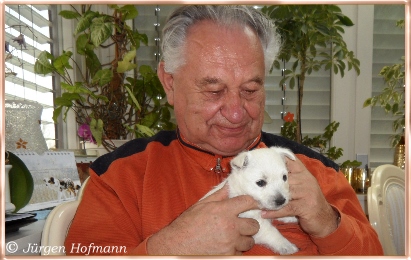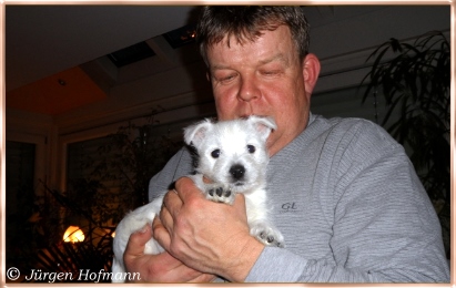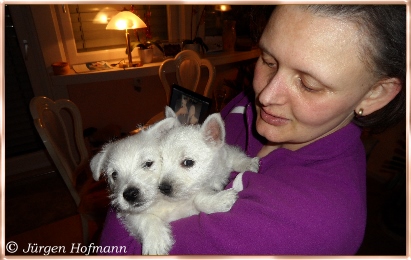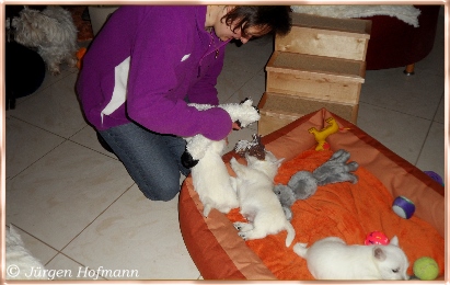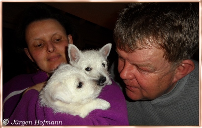 Sie konnten es kaum glauben wie munter und aktiv die Kleinen schon sind und wie liebevoll die Großen mit ihnen umgehen und spielen ! Sie kannten es nur von den Bildern und es ist natürlich ganz was anderes die Rasselbande live erleben zu können. Die Welpen genossen die Aufmerksamkeit in vollen Zügen und so war auch für sie der Tag sehr schön und aufregend ! Sie gingen unerschrocken auf ihre neuen Besitzer zu, lißen sich jede Knuddelaktion und Spielerei gefallen und für alle war es ein Riesenspaß ! |