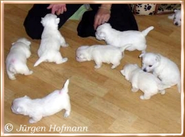 Ihnen sind die Geräusche im täglichen Haushalt vertraut, haben Kontakt zu Besuchern und Kindern. In den 10 Wochen, die sie bei uns sind, werden sie tierärztlich betreut, mehrfach entwurmt und in der 8. Woche erhalten sie die erste Impfung und werden gechipt. Unsere Hunde, die wir zur Zucht nehmen, müssen alle medizinische Kriterien bestehen, nicht nur die HD-Hüftgelenksdysplasie, ED-Ellenbogendysplasie, PL-Patella- Luxation und PRA- progressive Retina Atrophie. Auch werden unsere Hunde auf Taubheit untersucht und einer Audiometrie (Hörtest) unterzogen. Diese Untersuchung ist z.B. bei der Rasse Dalmatiner Pflicht, da diese Rasse auf der Liste für angeborene Taubheit an erster Stelle steht, gefolgt von der Rasse Jack Russel. Der West Highland White Terrier wird auf Rang 20 geführt. Es kommt sozusagen sehr selten vor, aber auszuschließen ist es nicht. Die weißfarbigen Hunde neigen eher dazu, dieses hat uns ein Tierarzt, dessen Fachgebiet die Neurologie ist, mitgeteilt. Jetzt fragen Sie sich, warum wir diese Untersuchung machen, obwohl es bei dieser Rasse kaum auftritt? Wir hatten einen Welpen, bei dem die Audiometrie-Untersuchung im Alter von ca. 1 Jahr gemacht wurde und der leider taub war. Nun stellte sich die Frage: War es eine angeborene Taubheit oder hat der Welpe im Alter von 12 Wochen ein Antibiotikum erhalten, das ihm geschadet hat, nachdem er einen Schnupfen hatte und bei einer Untersuchung Bakterien gefunden wurden, die da nicht hingehören... Liebe Welpenkäufer, achtet bitte darauf und erkundigt euch vorab beim Tierarzt, ob das Antibiotikum den Welpen auch nicht schadet. In einem gewissen Alter kann es zu Folgeschäden führen, die man nicht mehr beheben kann... Weitere Infos zum Thema gibt es hier: www.wuff.de Aufgrund dieses Vorfalls wurden unsere Zuchttiere untersucht und keines hat eine Taubheit. Aus der Verantwortung heraus, die wir den Welpen gegenüber haben, werden wir diese zusätzliche Untersuchung bei all unseren Zuchttieren beibehalten. Unser erklärtes Zuchtziel ist es, dass wir gesunde, wesensfeste Tiere vermitteln. Die zukünftigen Besitzer sollen Freude an ihrem neuen Familienmitglied haben, das sie ein Hundeleben lang begleitet. Falls Sie sich für solch ein neues Familienmitglied interessieren, setzen Sie sich bitte rechtzeitig mit uns in Verbindung. Es ist uns sehr wichtig, die Besitzer bzw. die Familien unserer Nachzucht vor dem Kauf intensiv kennenzulernen. Genauso wichtig, wie es Ihnen sein sollte, uns genau unter die Lupe zu nehmen. Ernsthafte Interessenten sind uns jederzeit, auch ohne Voranmeldung, herzlich willkommen ! |
